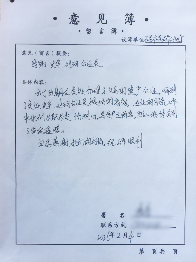 当事人为表达谢意,向公证处提交感谢信,既是对史华、刘珂专业素养与服务态度的高度认可,更是对我处全体公证人员践行司法为民初心使命的充分肯定。下一步,我处将以此为动力,持续加强专业能力建设,不断优化服务流程、提升服务质效,以更高效、更专业、更暖心的公证法律服务,用心用情为群众办实事、解难题,切实维护群众合法权益。