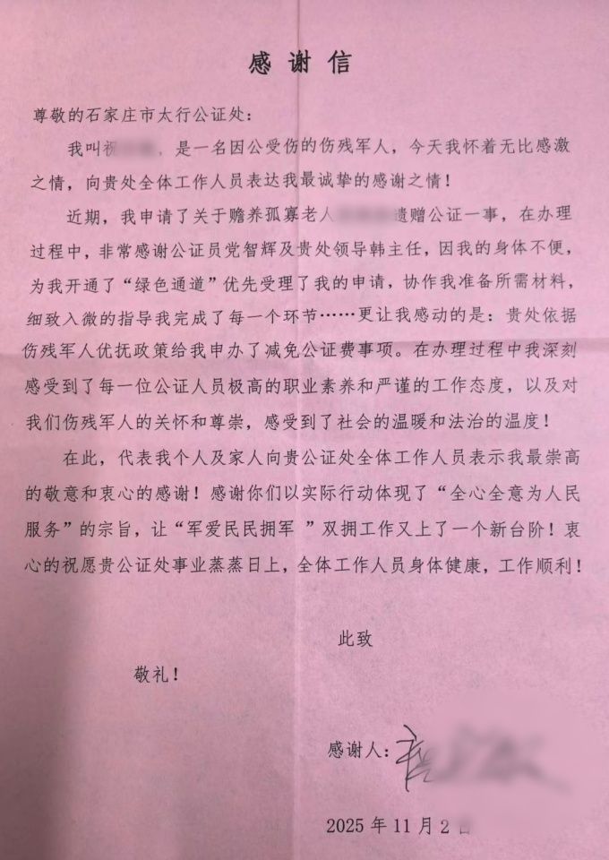 近日,伤残军人祝某将一封饱含真挚情感的感谢信送到石家庄市太行公证处,字里行间满是对公证处工作人员专业服务、贴心关怀的感激之情,生动诠释了“军爱民、民拥军”的深厚情谊与法治服务的温度。