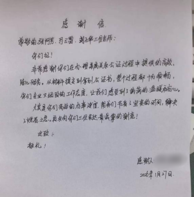 事后,李先生专程发来感谢信,对我处工作人员高效贴心的服务、专业细致的工作态度给予了高度赞扬,字里行间满是认可与感激。此次加急办理,是我处践行“我为群众办实事”的生动实践,也进一步彰显了公证服务为民、高效务实的工作作风。